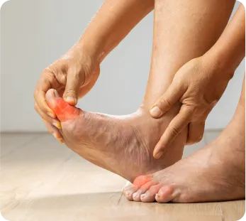A painful arthritis caused by uric acid crystal build-up in joints. It commonly affects the big toe but can involve the ankles, knees, hands or elbows. Gout attacks usually happen suddenly, often at night, and cause redness, swelling, and intense pain in the affected joint.